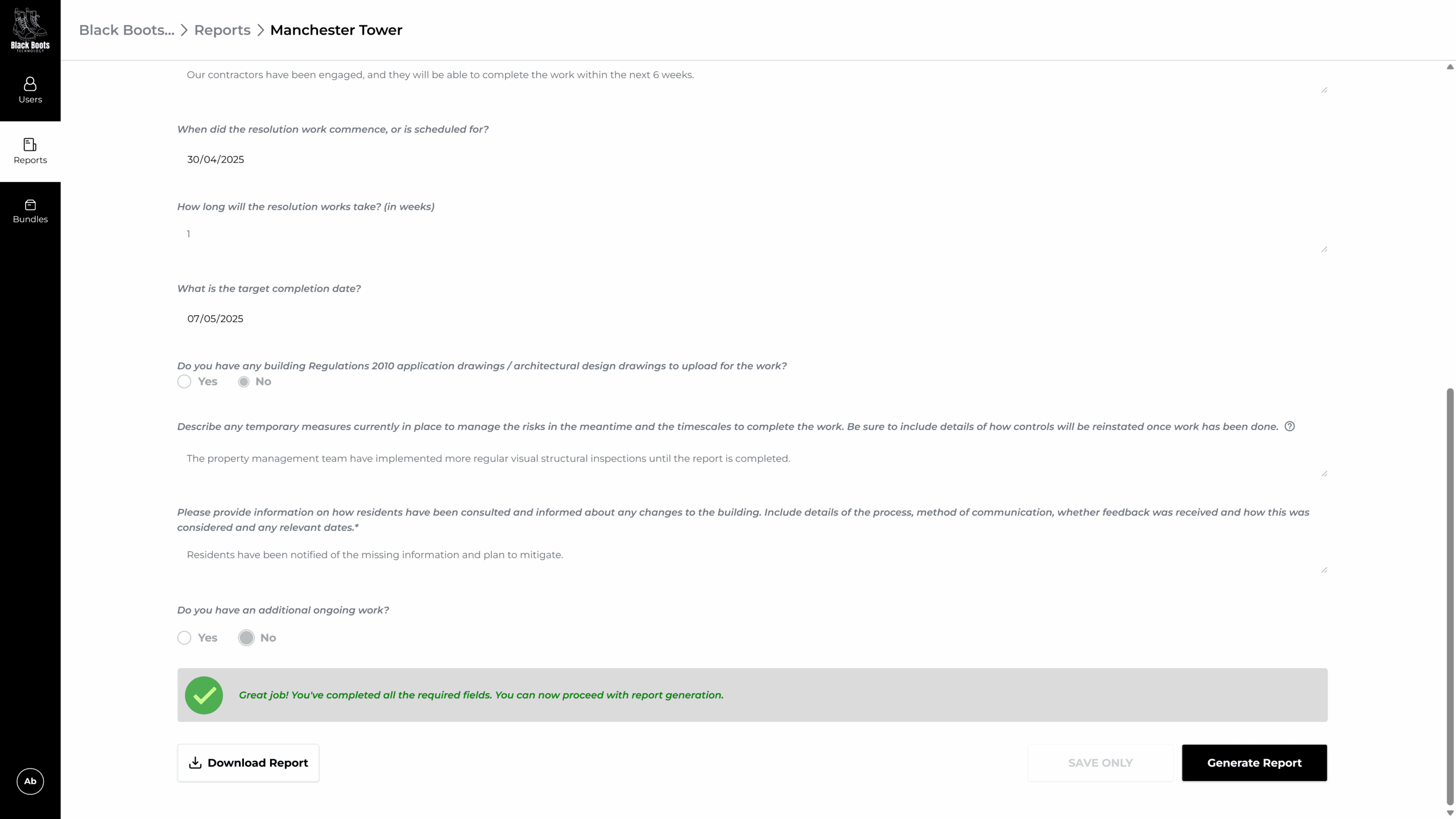 Effortlessly upload your building safety documents and input essential information through our intuitive guided prompts. BB-SCR walks you through exactly what’s needed, making the process straightforward even if you’re new to safety case reporting.